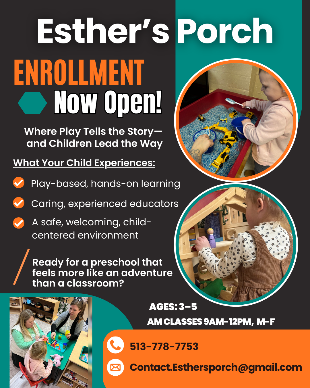 At Esther’s Porch Playschool, children ages 3–5 discover the joy of learning through hands-on play, creativity, and exploration. Our half-day program blends movement, literacy, and imagination in a warm, nurturing environment. With small group sizes, a spacious gym, and Reggio-inspired learning centers, every day is a chance for your child to grow in confidence, curiosity, and friendships—all while having fun.