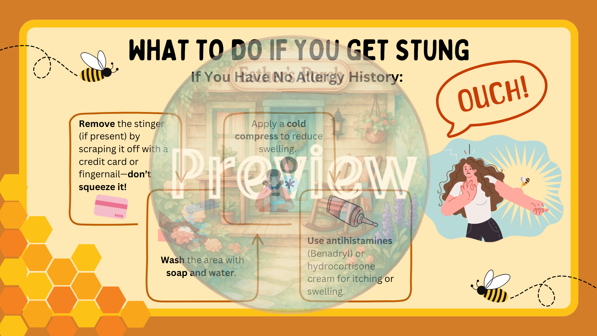 The guide includes step-by-step instructions for treating a bee sting—like removing the stinger, cleaning the area, and using ice or soothing remedies. It also shares basic safety tips for being around bees, including how to stay calm, avoid swatting, and respect their space.