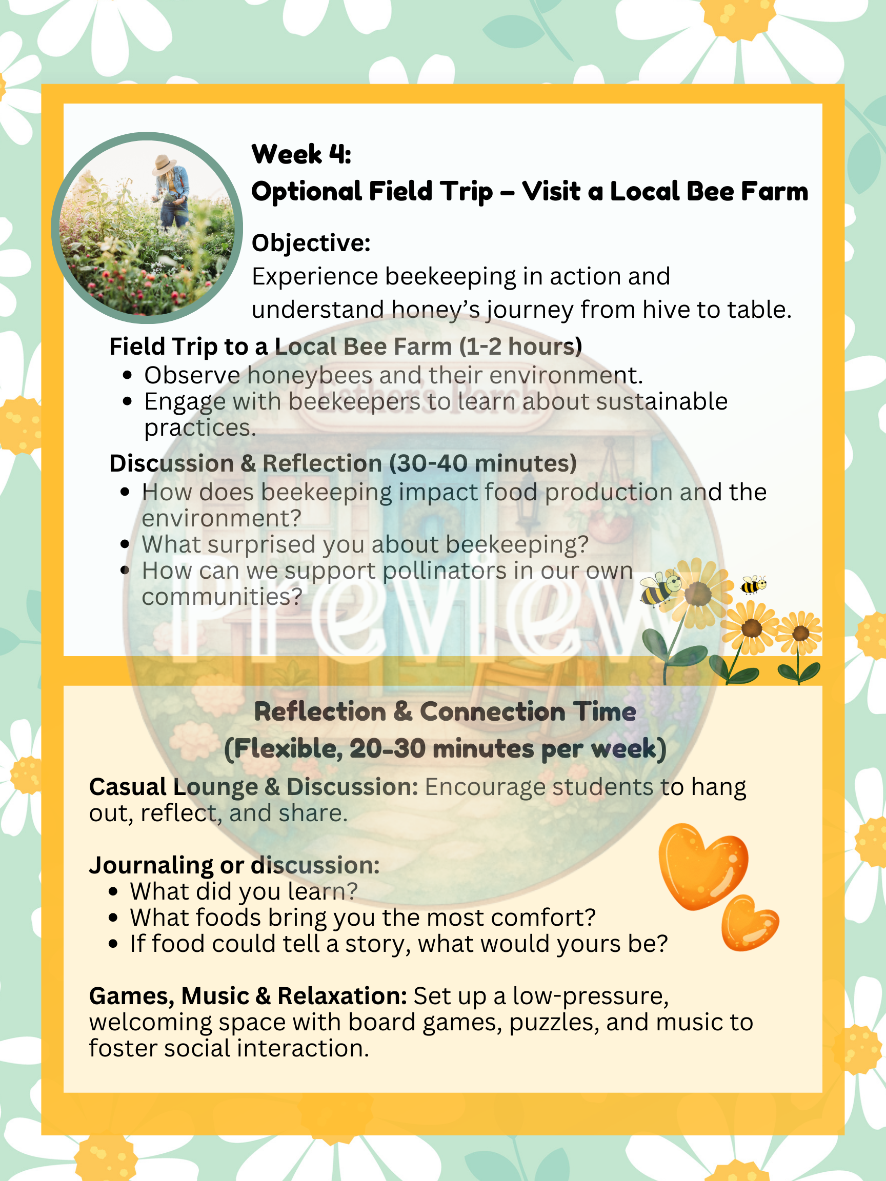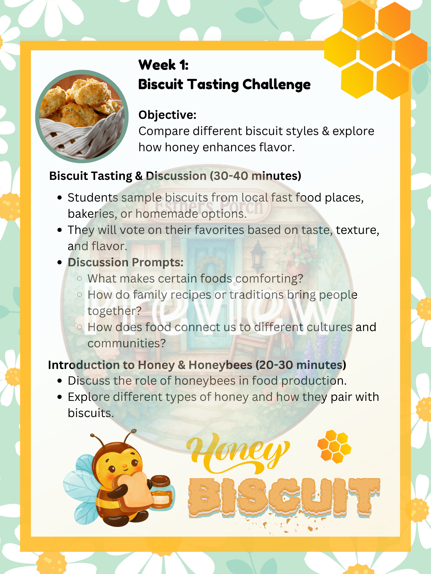 This lesson promotes social connection, hands-on learning, and food appreciation through the theme of biscuits and honey. Students will participate in discussions about food, cooking, and experiential learning, gaining knowledge about honeybees' impact on food production and the cultural significance of communal meals. Foster a deeper understanding of the importance of food in cultural and social contexts. Encourage students to work together and develop practical skills through hands-on cooking experiences. Introduce the role of honeybees in food production and their critical role in the environment. Prompt self-reflection on comfort foods, traditions, and personal relationships with food. Suitable for middle/high school levels and adaptable for homeschool, alternative education, or classroom use. Theme: Honeybees & Biscuits - Exploring Community, Connection, and Culinary Skills.