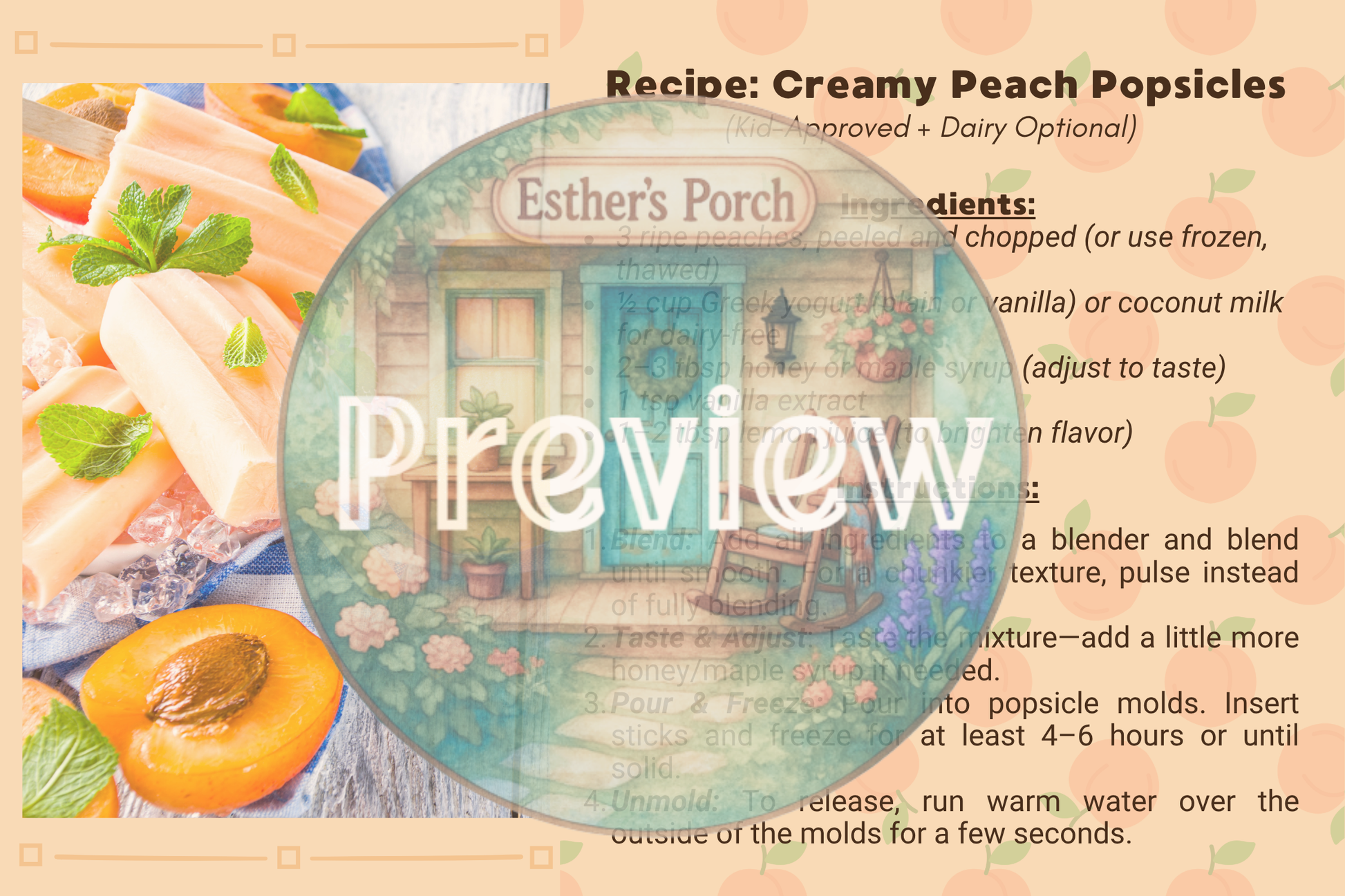 Cool down and sweeten up with this fresh and fruity Peach Popsicle Recipe Card, your go-to guide for making summer magic on a stick. Bursting with juicy peach flavor and just the right hint of sunshine, this easy-to-follow recipe is perfect for kids, grown-ups, and everyone in between. With simple ingredients and step-by-step instructions, you will have freezer-ready treats in under ten minutes. The card is designed in a charming, summer-inspired style and fits perfectly in standard four by six recipe boxes or sleeves, making it a functional and delightful addition to your kitchen. Whether you are prepping for a backyard picnic, building a gift basket, or looking for a fun kitchen activity, this card brings all the peachy vibes. No artificial nonsense just pure popsicle joy.