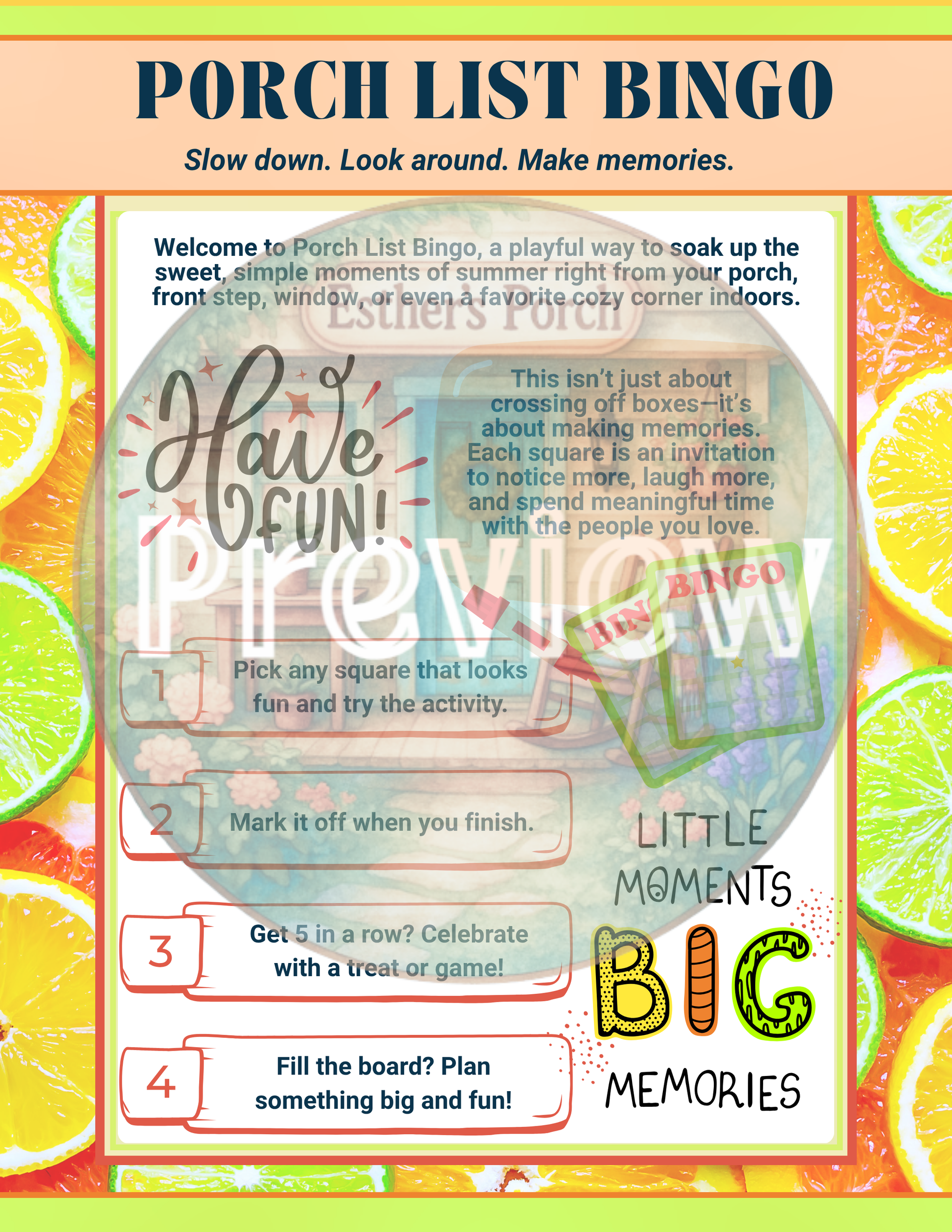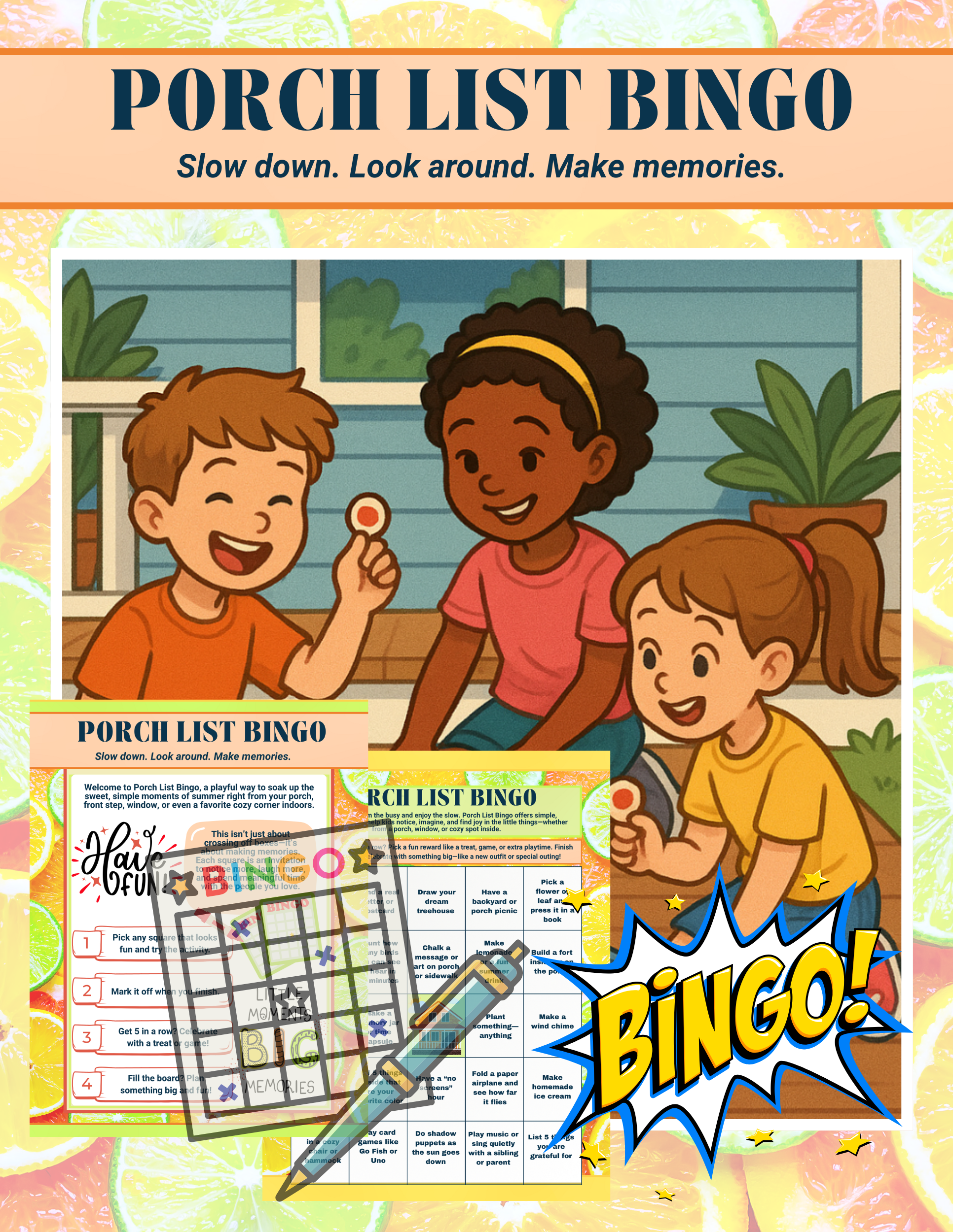 Perfect for families, classrooms, or summer programs, Porch List Bingo makes mindfulness fun with a screen-free twist. Grab a pencil, check off your squares, and let the magic of simple moments bring joy to your day.
